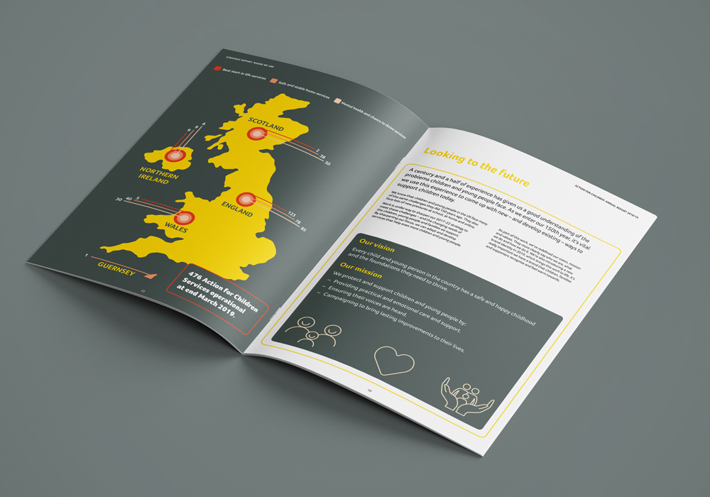 Design and layout of Action for Children's 2019 Annual Report. Plus various corporate literature and campaign work (in previous brand).